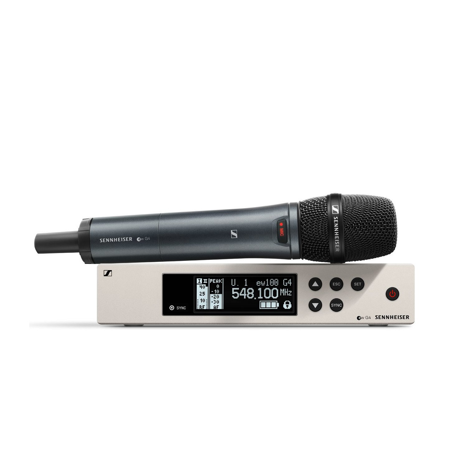 Беспроводная РЧ-система, 470-516 МГц, 20 каналов, рэковый приёмник EM 100 G4, ручной передатчик SKM 100 G4-S с кнопкой. Динамический кардиоидный капсюль MMD835-1.