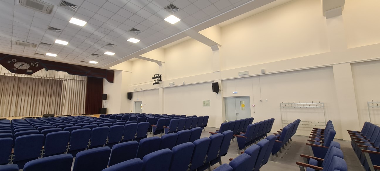 Современная школа — это не только классы и учебные кабинеты, но и полноценная культурная площадка. Актовый зал должен быть технически оснащён так, чтобы справляться с любыми форматами мероприятий — от утренников до выпускных и городских праздников. Именно такой уровень мы реализовали в школе на ул. Автолюбителей, 2/1.
