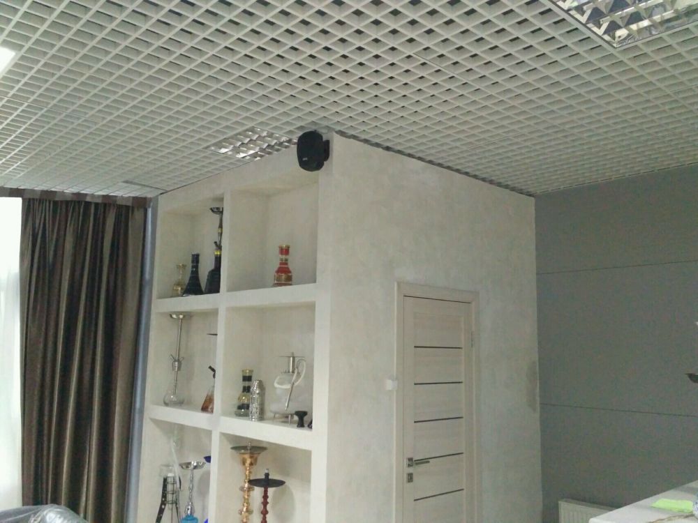 Один из приоритетов при реализации подобных проектов — сохранить эстетику пространства. Поэтому все акустические и проекционные элементы подбирались с учётом дизайна кальянной. Потолочные динамики окрашены в тон отделки, а сам проектор размещён на специальном креплении с возможностью точной настройки угла проекции.