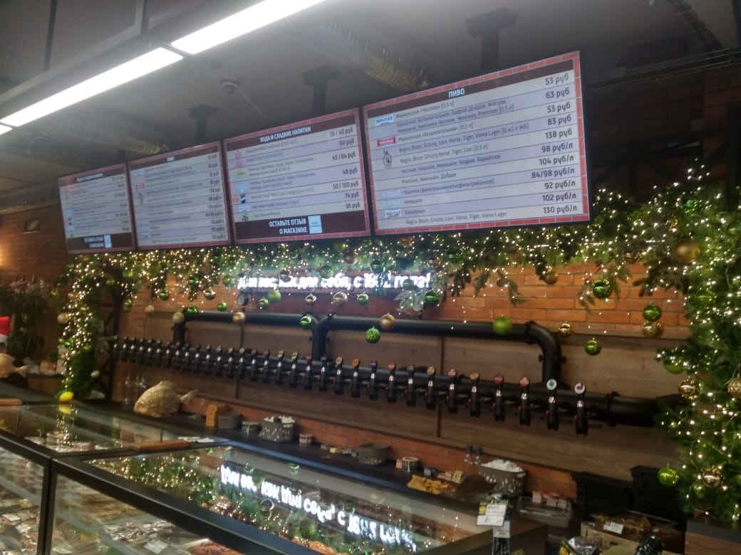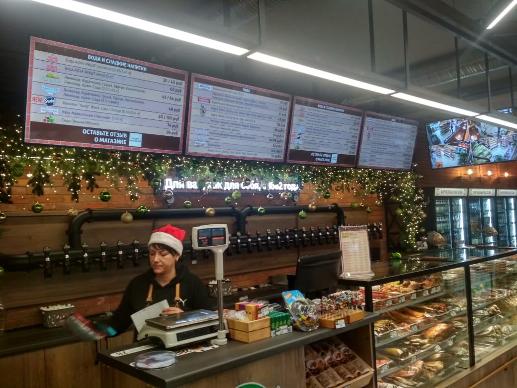 Четыре экрана объединены в единую информационную систему, демонстрирующую актуальный ассортимент, цены и специальные предложения.